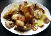Spoon the reserved 1/4 cup of lemon juice mixture over the chicken as it roasts. Test for doneness by piercing with a knife; chicken will be done when juices run clear and dark meat is tender, about an hour. Serves 3 to 4.